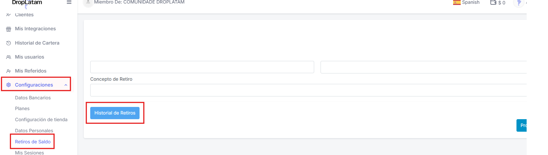Dirígete a la sección ''Configuraciones'' y "Retiros de saldo" (Historial de Retiros).