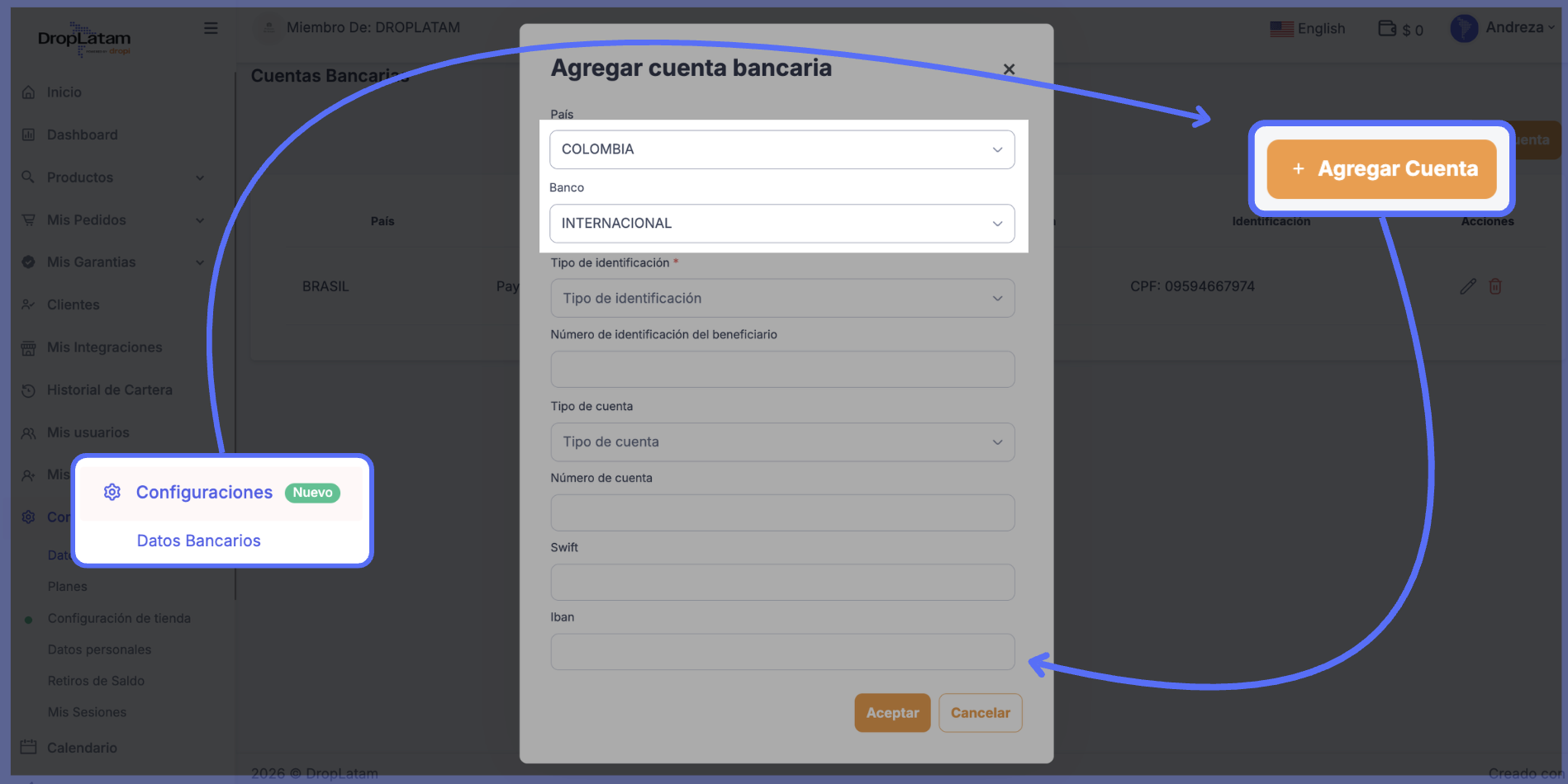 Tengo dificultades para agregar mis datos bancarios en la plataforma. ¿Qué hacer? Abre un ticket en el Formulario de Soporte DropLatam para recibir orientación.