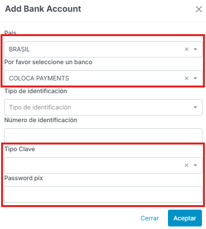 Tipo Clave: seleccione el tipo de clave Pix (correo electrónico, número de documento, número de teléfono o clave aleatoria).