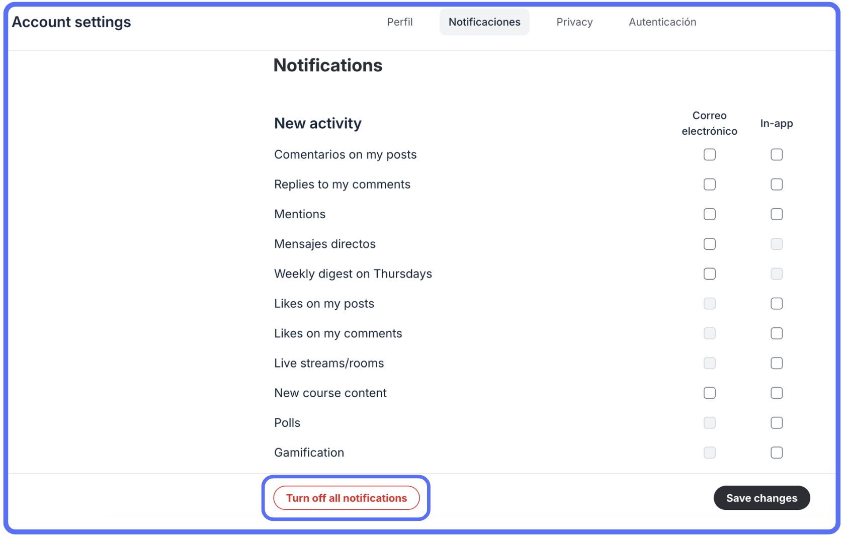 (Imagen 2) - Desmarca las notificaciones que no deseas recibir — o haz clic en "Turn off all notifications" para desactivarlas todas de una vez