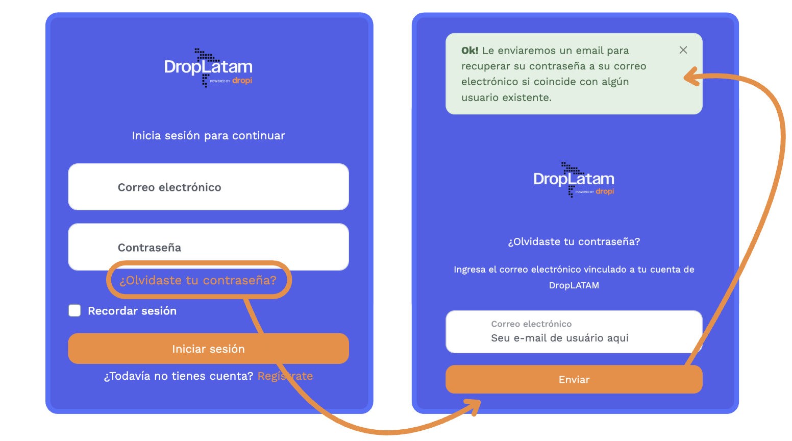 - En la página de acceso de DropLatam, haz clic en "¿Olvidaste tu contraseña?"