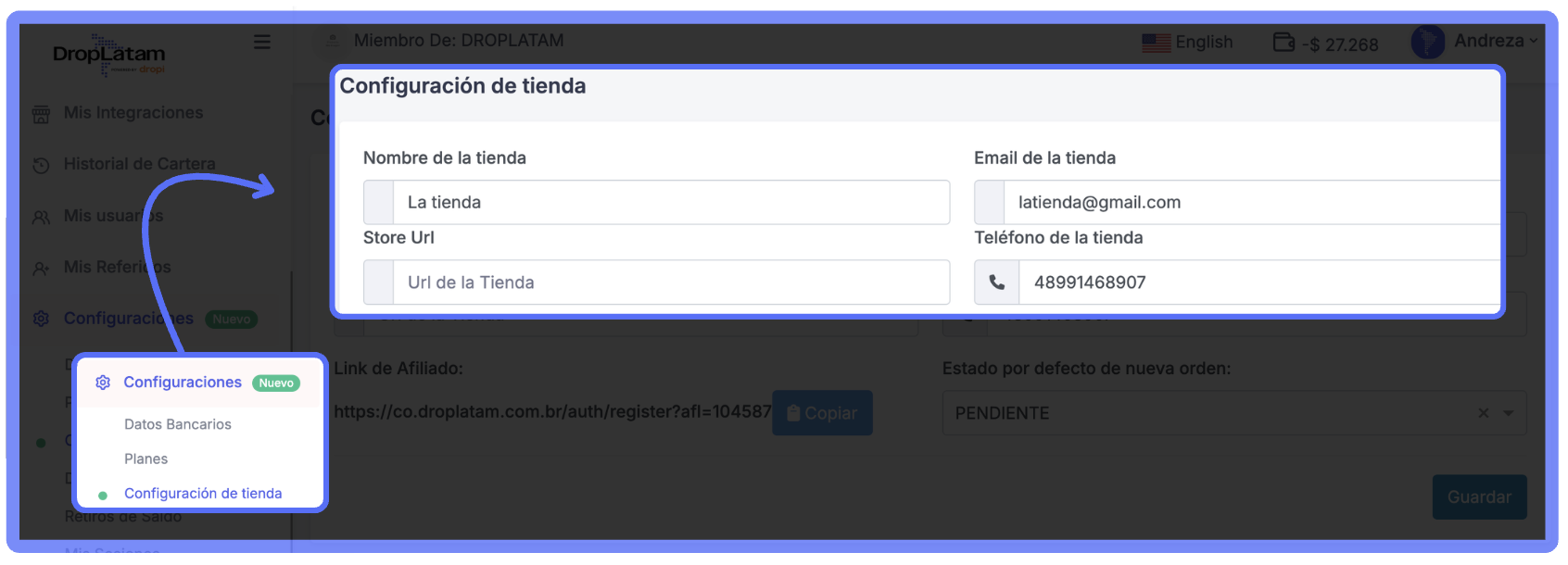 - Accede a la plataforma DropLatam y ve a Configuraciones > Configuración de la tienda