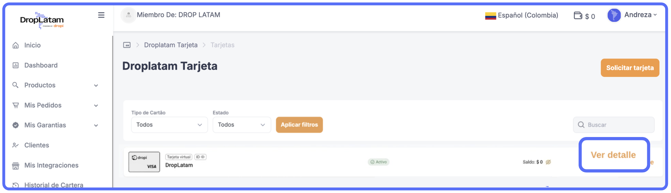 - Accede a DropLatam Card > Tarjetas y haz clic en "Ver Detalle" en la tarjeta deseada (Imagen 3)
