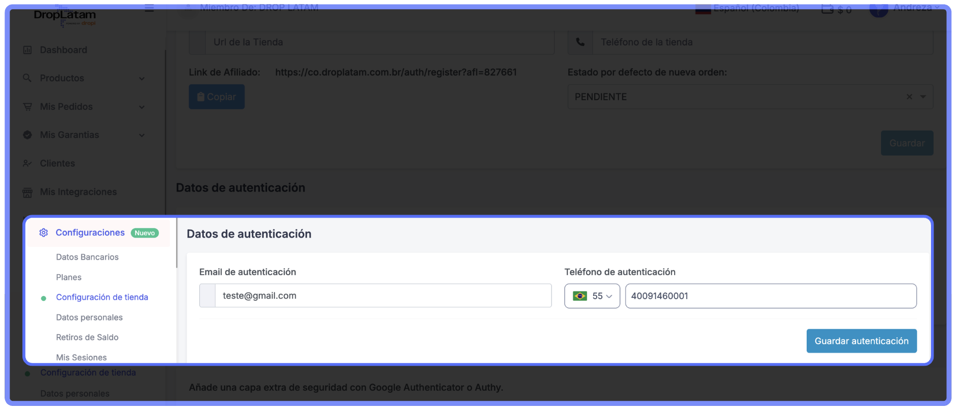 El campo de teléfono puede dejarse en blanco — la autenticación de DropLatam se realiza exclusivamente por correo electrónico.