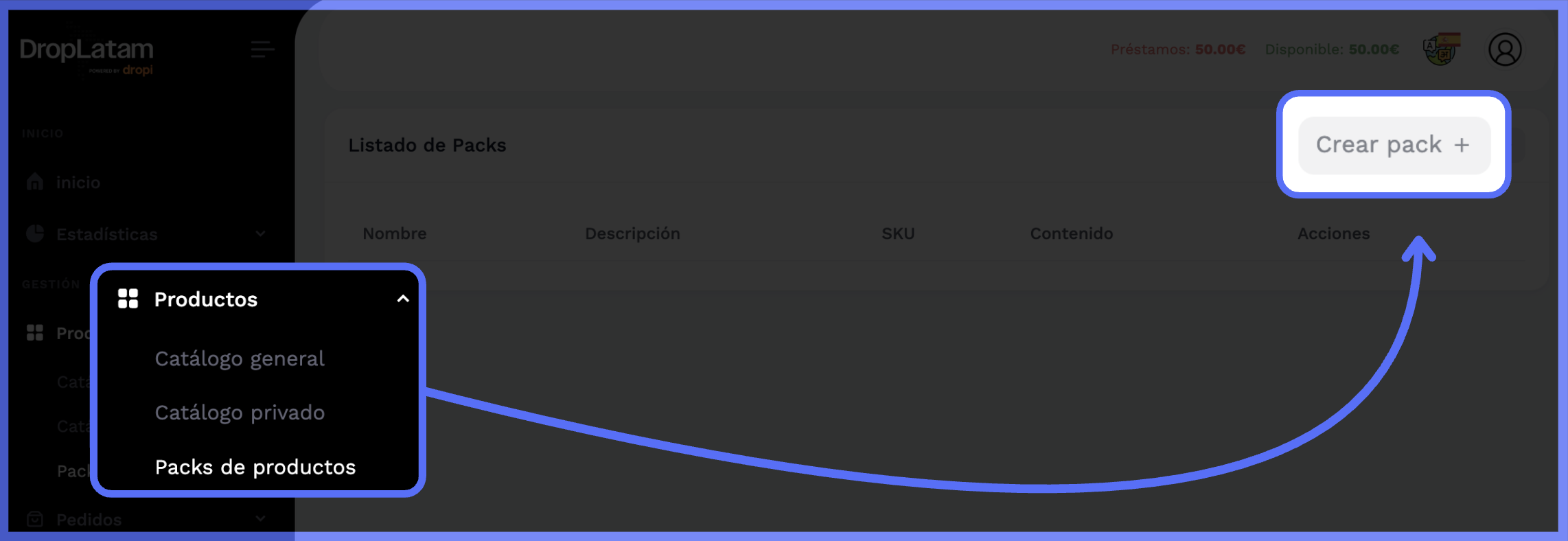 - En la plataforma DropLatam Europa, accede a Productos > Packs de productos