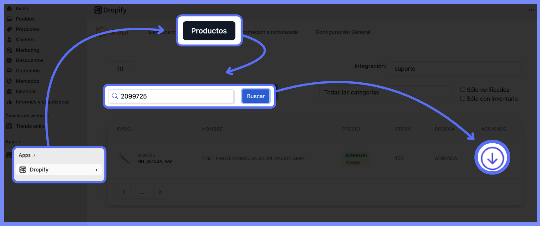 - En Dropify, haz clic en "Información Sincronizada"