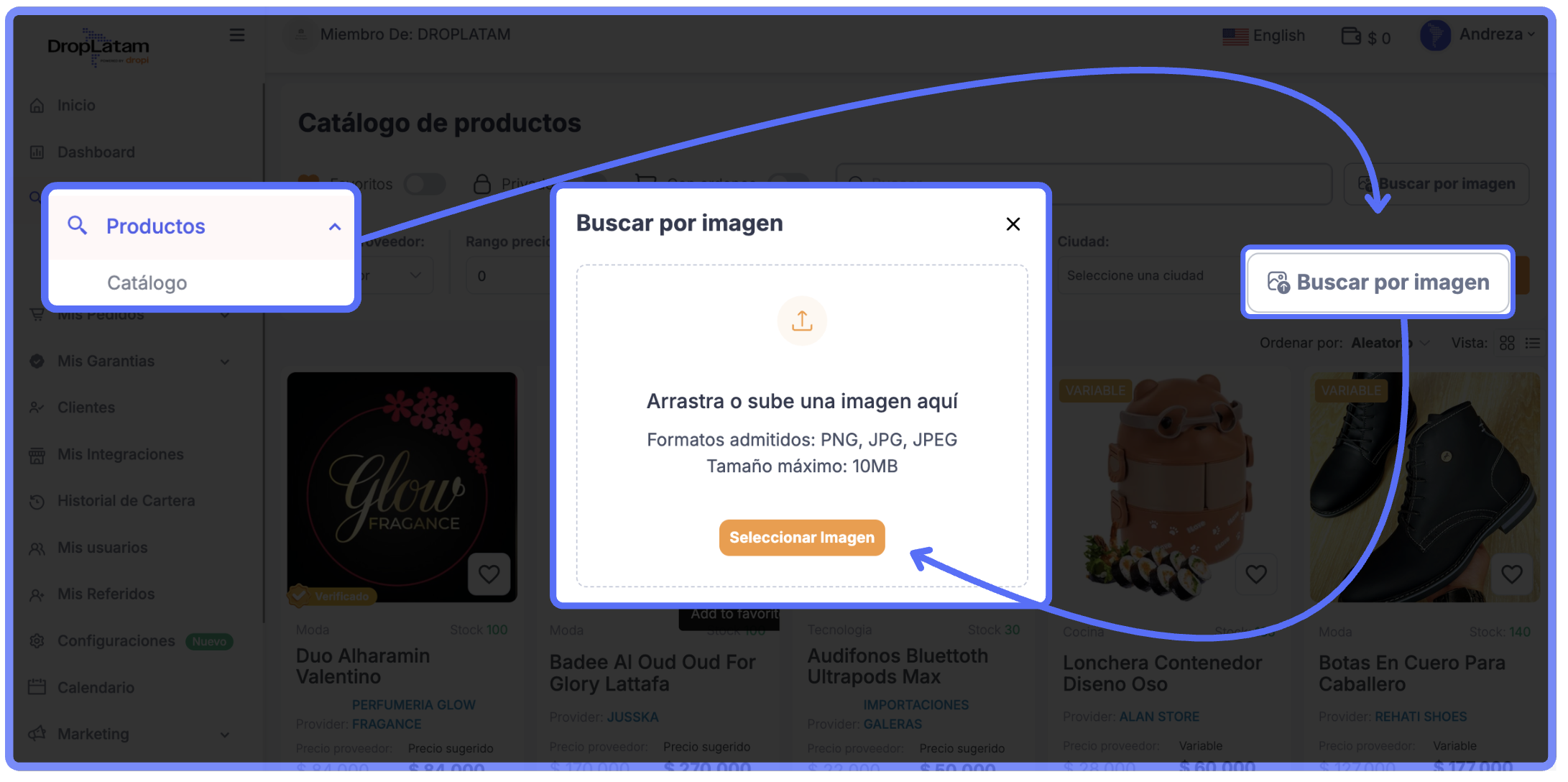 - Accede a Productos > Catálogo en la plataforma DropLatam
