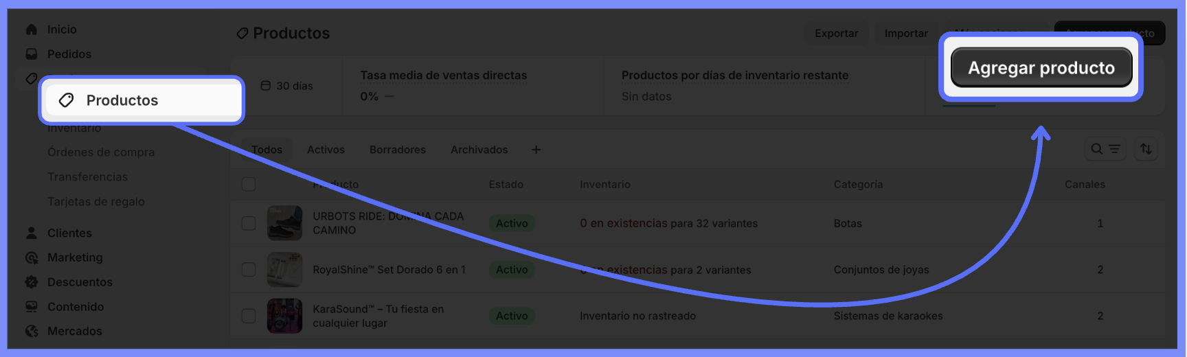 En el panel de Shopify, accede a Productos > Agregar producto (Imagen 6)