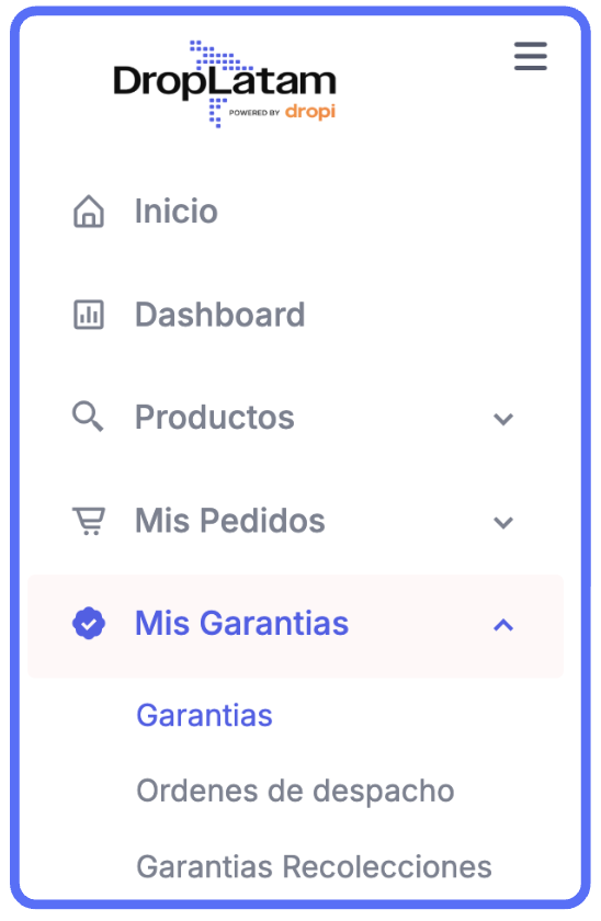 ¿Cómo hacer seguimiento a las garantías abiertas? Puedes acompañar las garantías pendientes, aprobadas, guías de recolección y despacho en el menú "Mis garantías" en la plataforma DropLatam.
