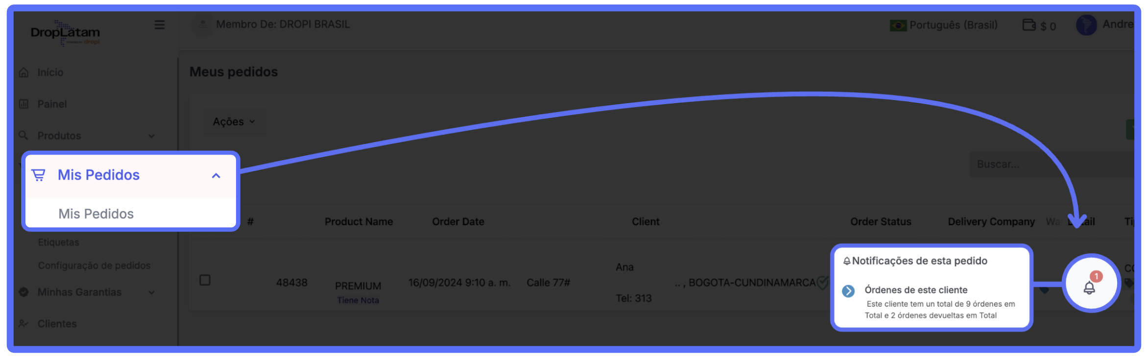 ¿Puedo ver el historial de pedidos de un cliente? Sí. Si el cliente ya realizó compras dentro de DropLatam, es posible visualizar un breve historial en los detalles del pedido.