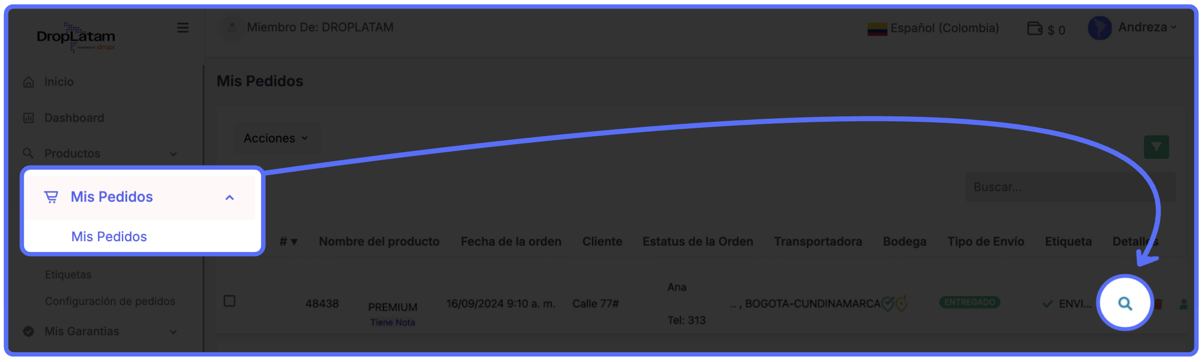 - Haz clic en el ícono de la lupa para abrir el pedido