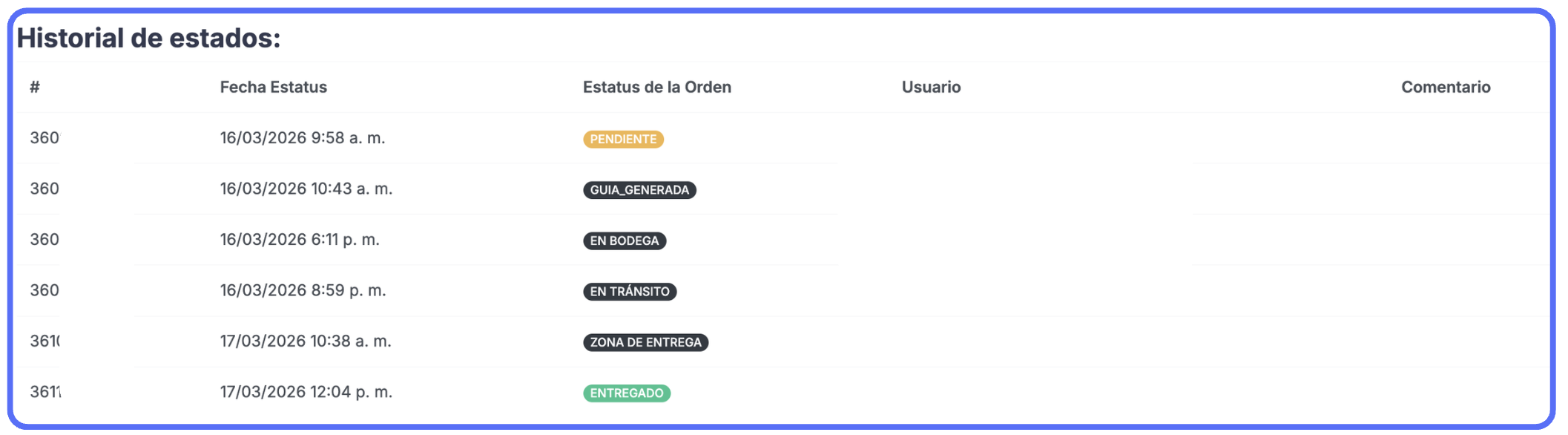 Si el pedido permanece largo tiempo sin actualización, haz seguimiento directamente en el sitio web de la transportadora o contacta al soporte.