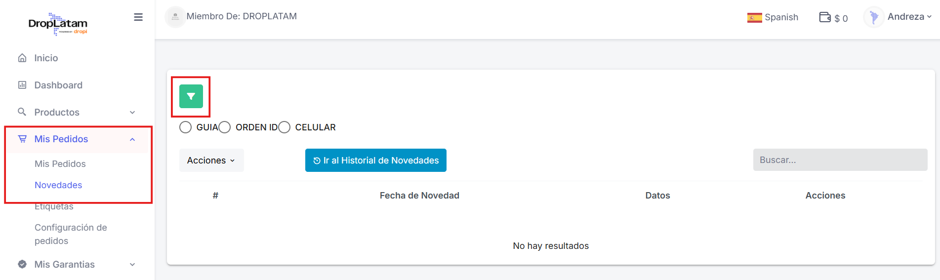En la plataforma DropLatam, accede a la sección “Novedades” dentro de “Mis Pedidos” en el menú principal.