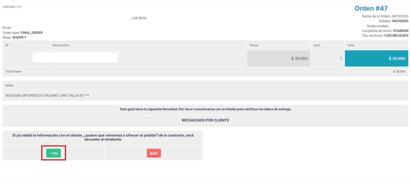 Siempre que un pedido no es entregado — ya sea por falta de encuentro entre el cliente y la transportadora, dirección incorrecta o rechazo del cliente al recibir el producto — la plataforma abrirá una novedad, para la cual deberás presentar una solución dentro de 24 horas.