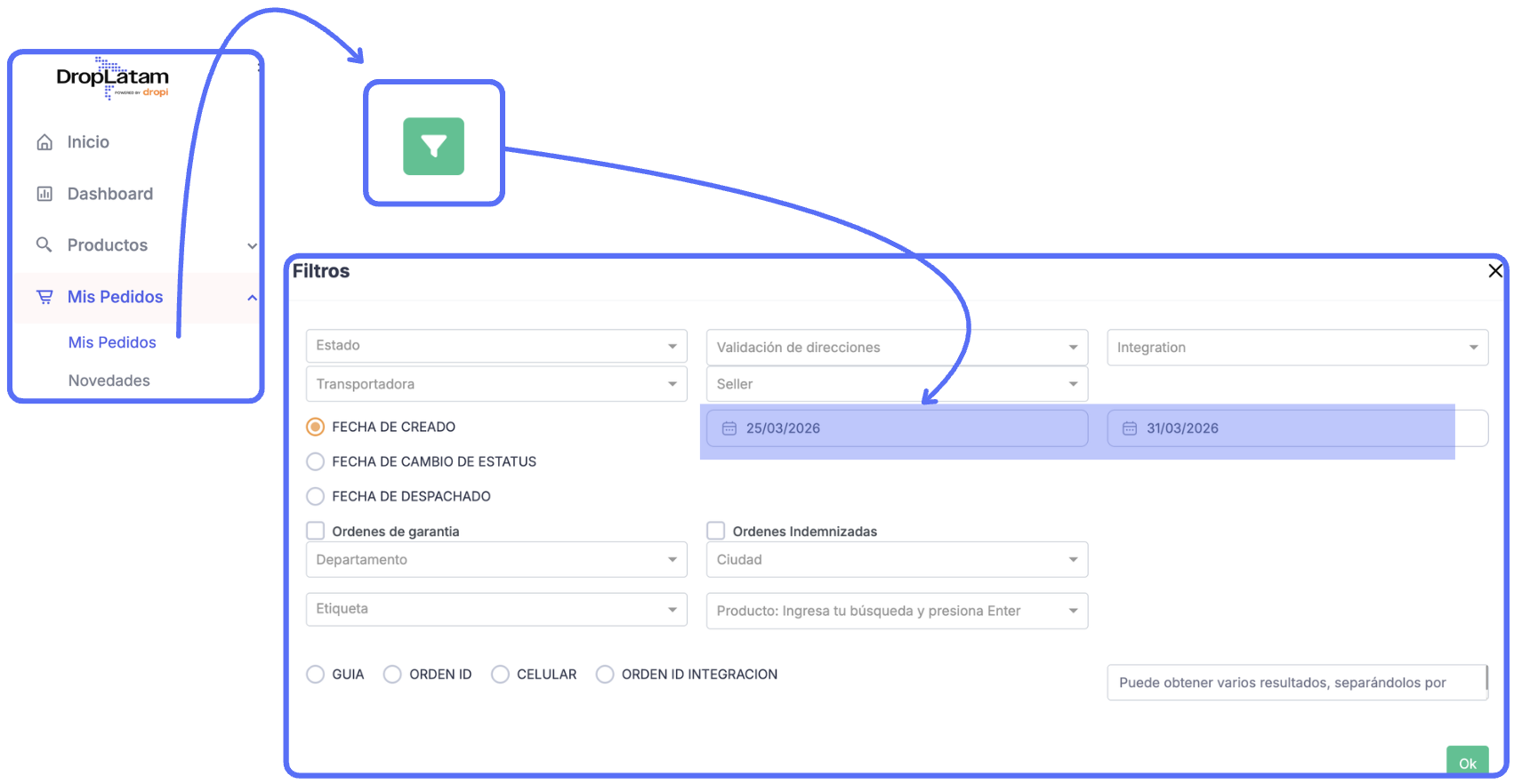 - Haz clic en "Ok" — todos los pedidos dentro del período seleccionado serán listados