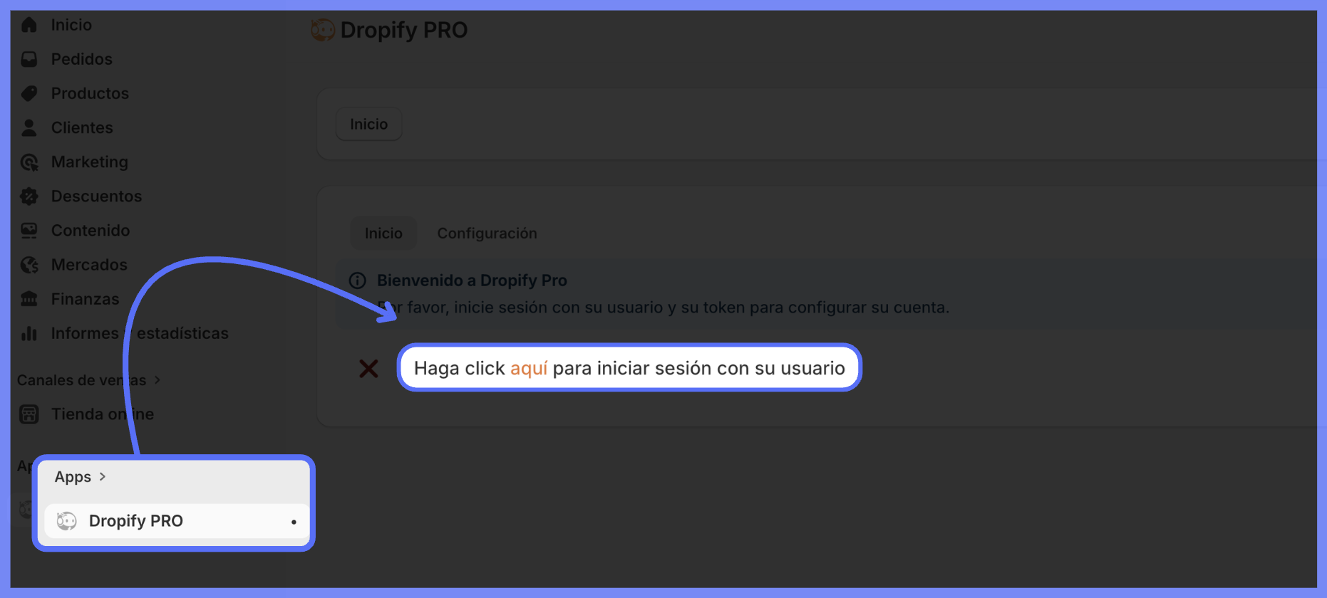 Después de instalar Dropify PRO, en la página que se abre haz clic en "Haga click aquí"