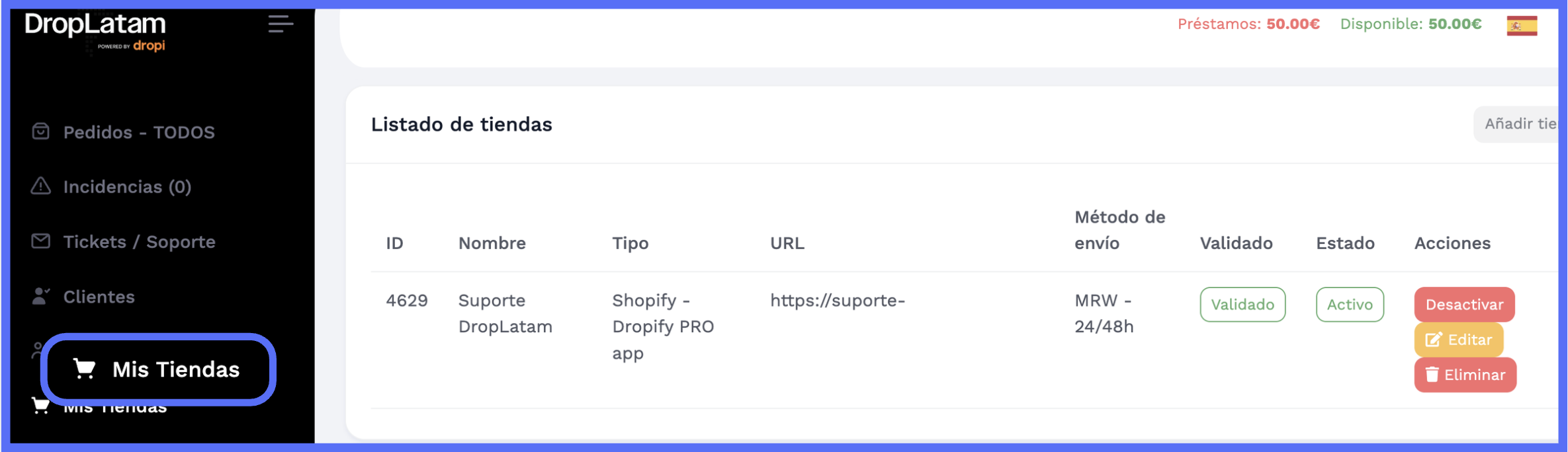 En "Mis Tiendas" dentro de Dropify PRO, confirma que tu tienda aparece en la lista