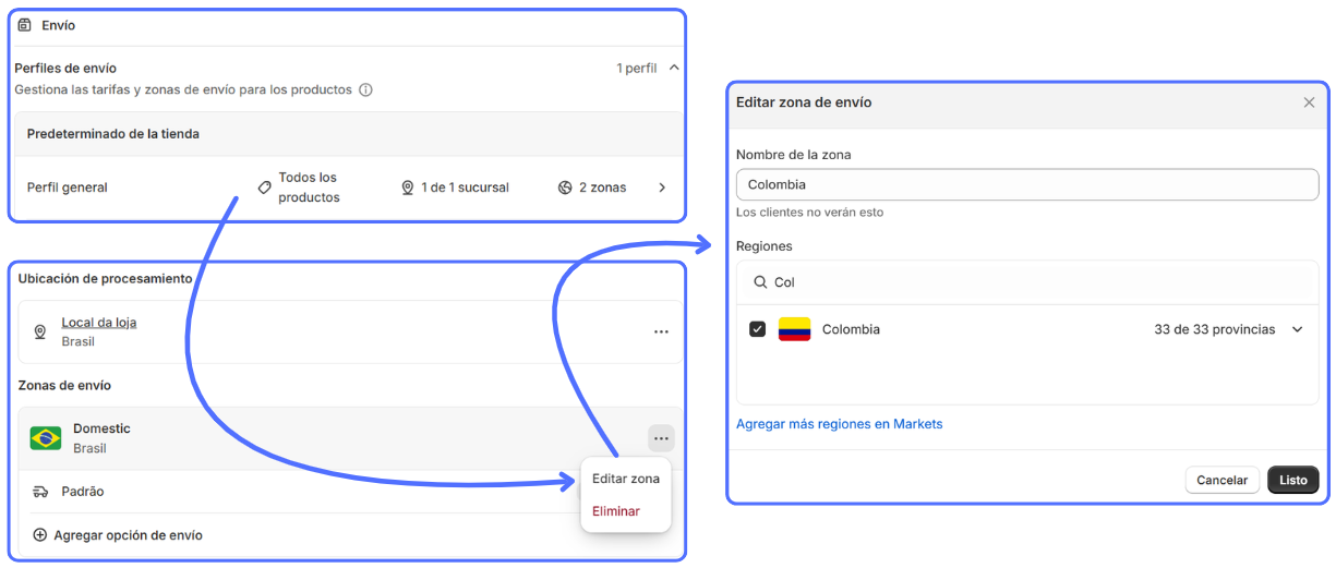 - En la sección "Ubicacion de procesamiento", haz clic en los tres puntos a la derecha y selecciona "Editar zona"