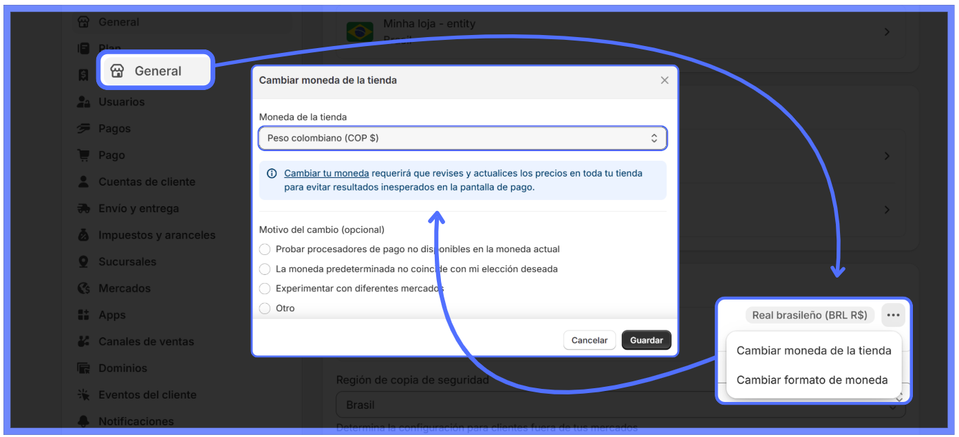 - Haz clic en los tres puntos al lado de la moneda actual y selecciona "Cambiar moneda de la tienda"