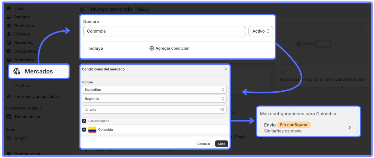Adapta el proceso al país en que deseas operar — si la operación es en México, crea un mercado para México; si es en Perú, crea para Perú, y así sucesivamente.