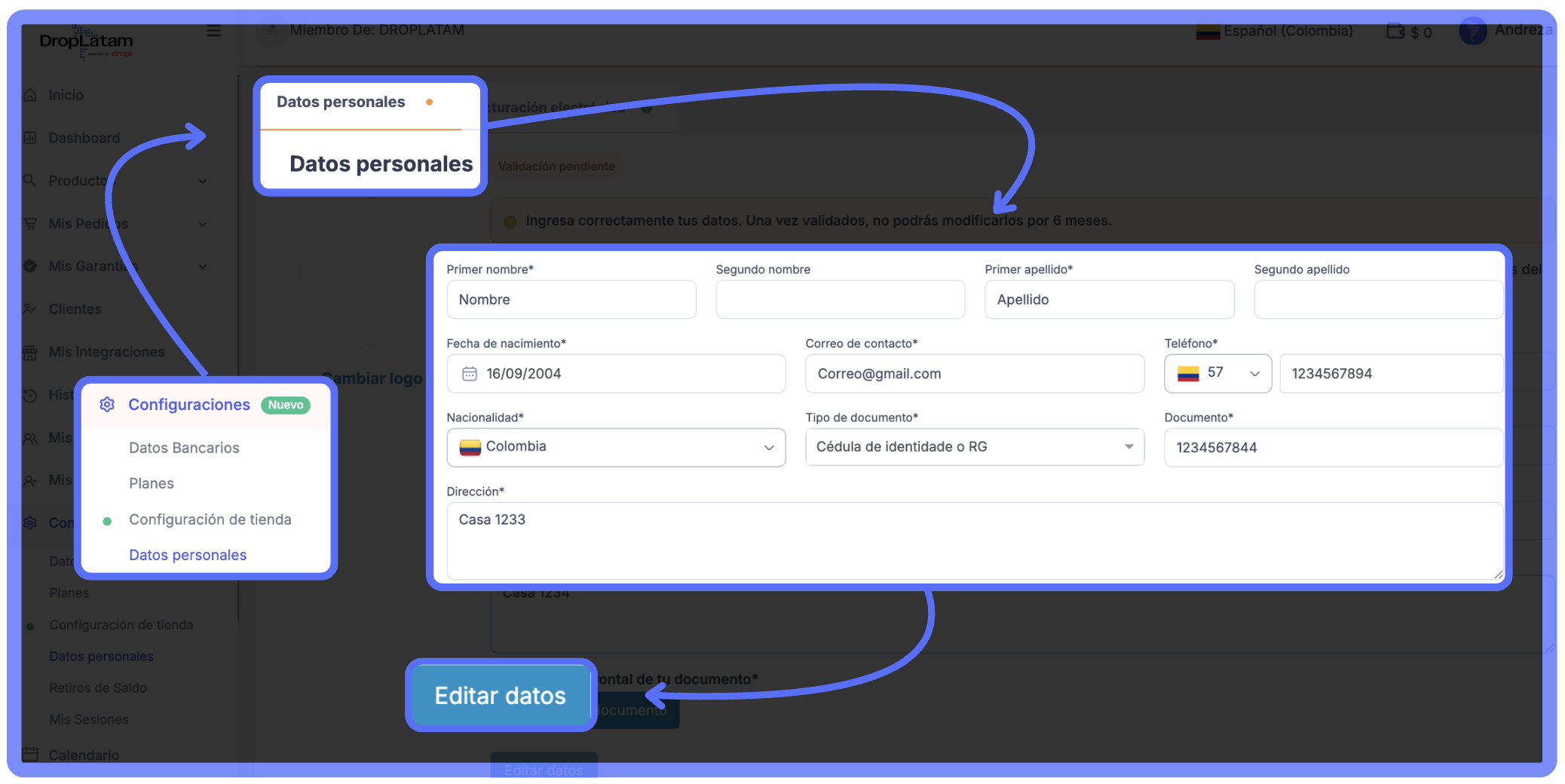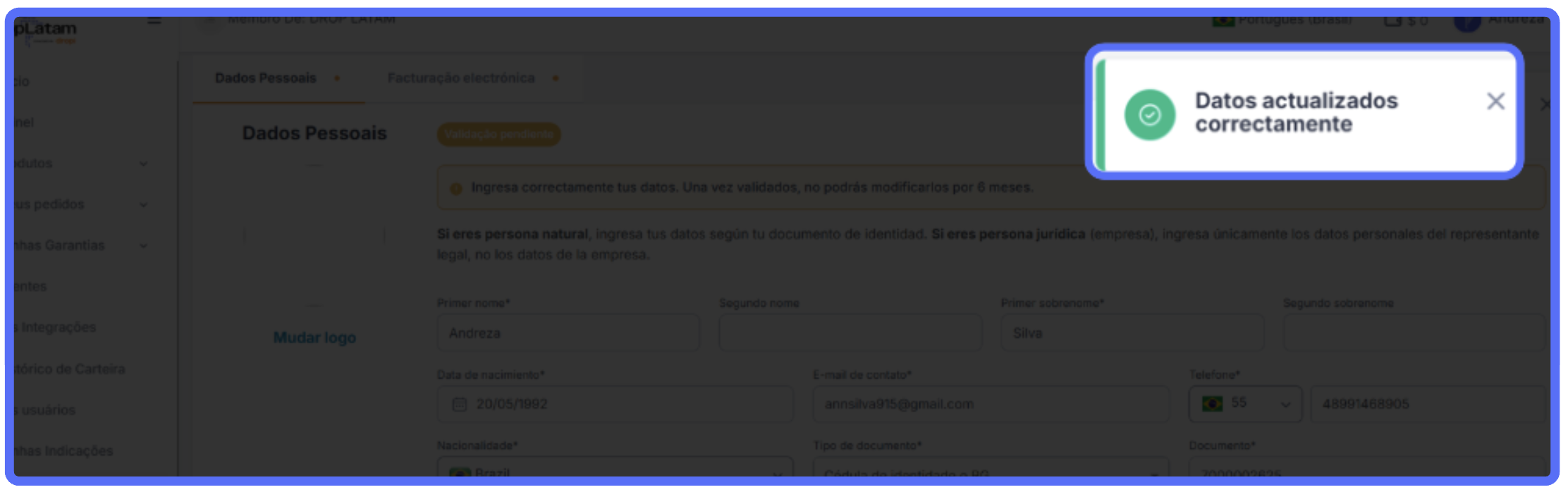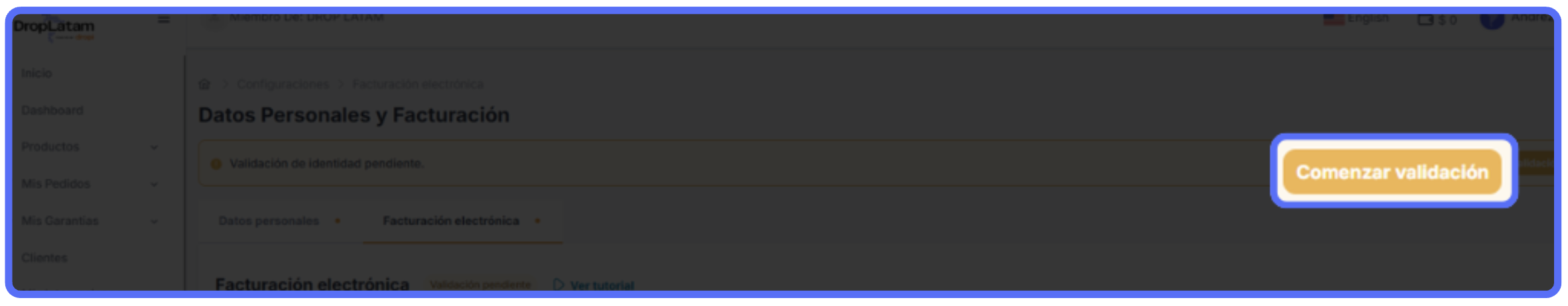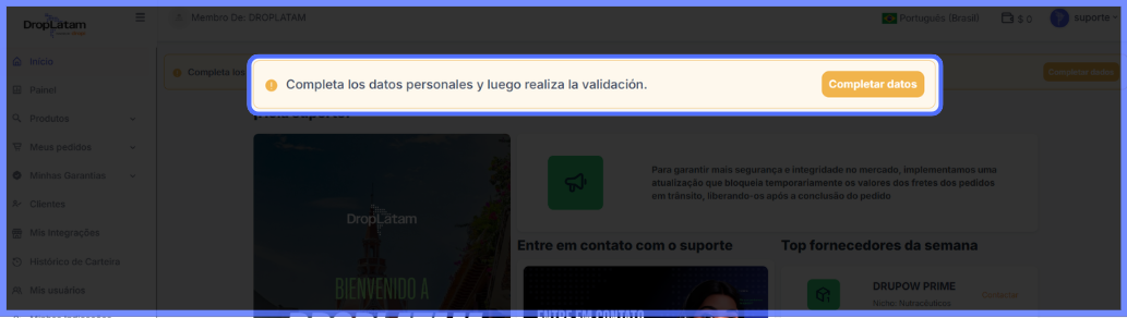 ¿Por dónde empiezo la validación? Al acceder a la plataforma DropLatam, se mostrará un mensaje en amarillo en la parte superior de la página. Haz clic en "Completar datos" para iniciar el proceso — serás redirigido al espacio de Datos Personales y Facturación. (Imagen 1)