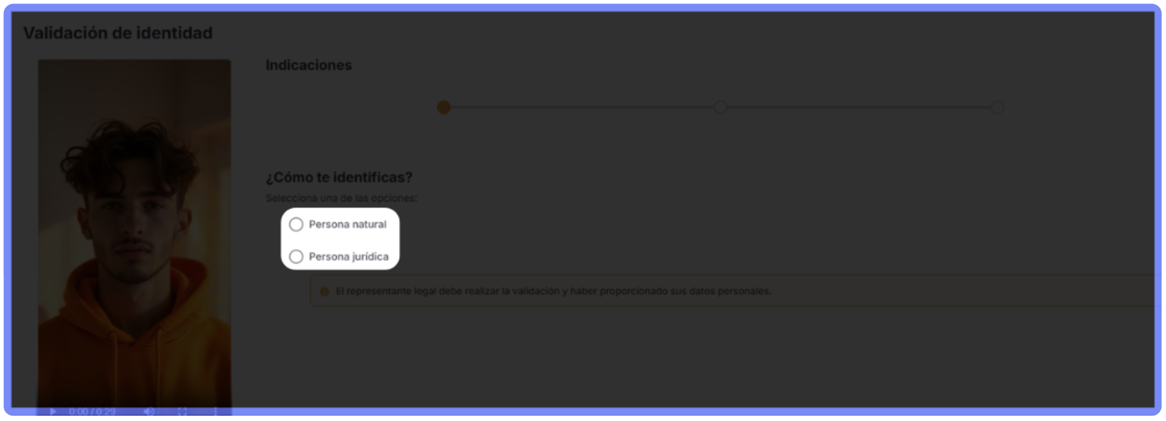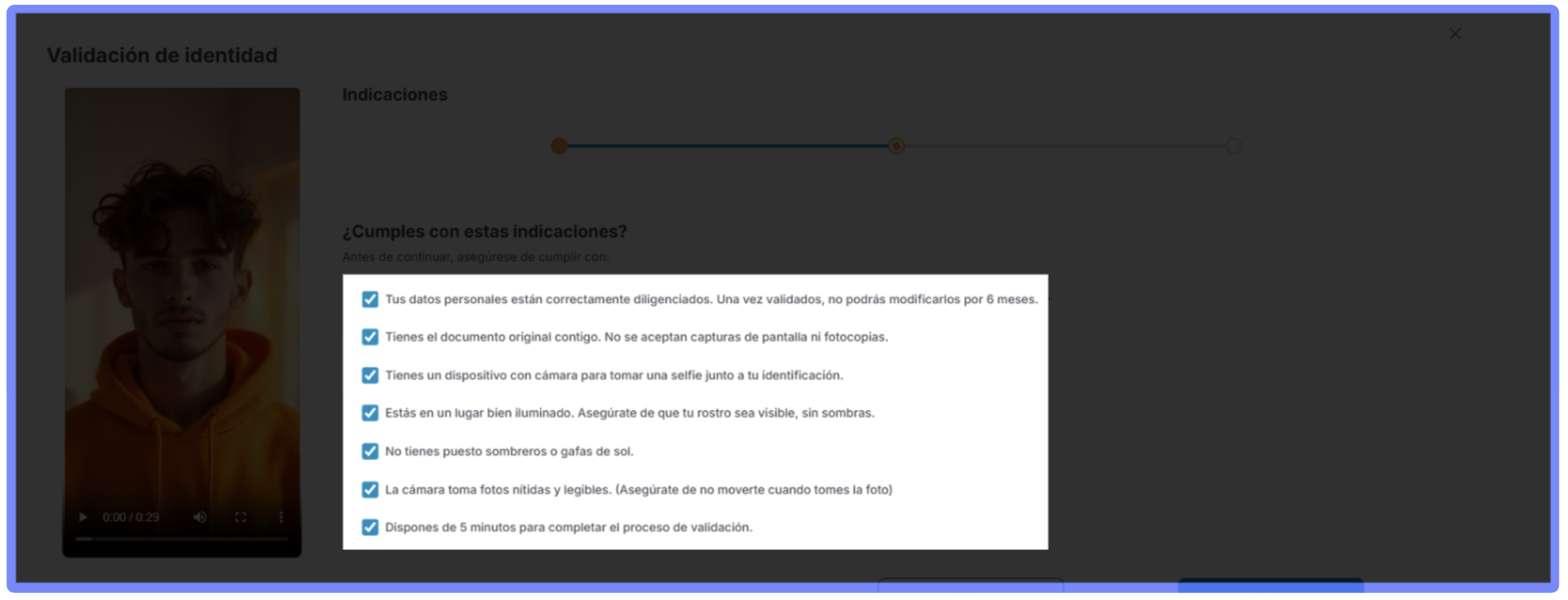 - Al grabar el video del rostro (si se solicita), posiciónate centrado y bien iluminado
