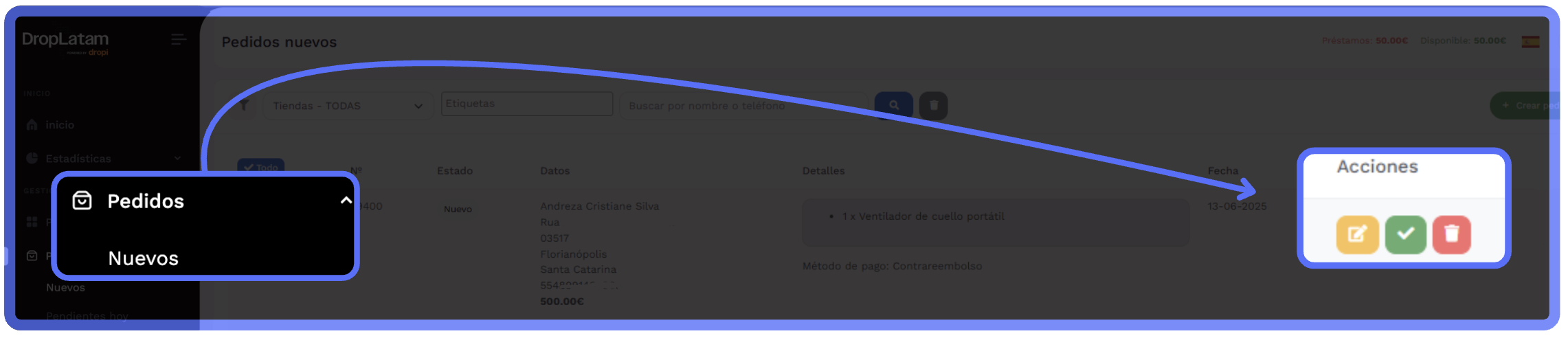 ¿Cómo confirmar un pedido? Haz clic en el ícono verde para confirmar el envío del pedido a la bodega.