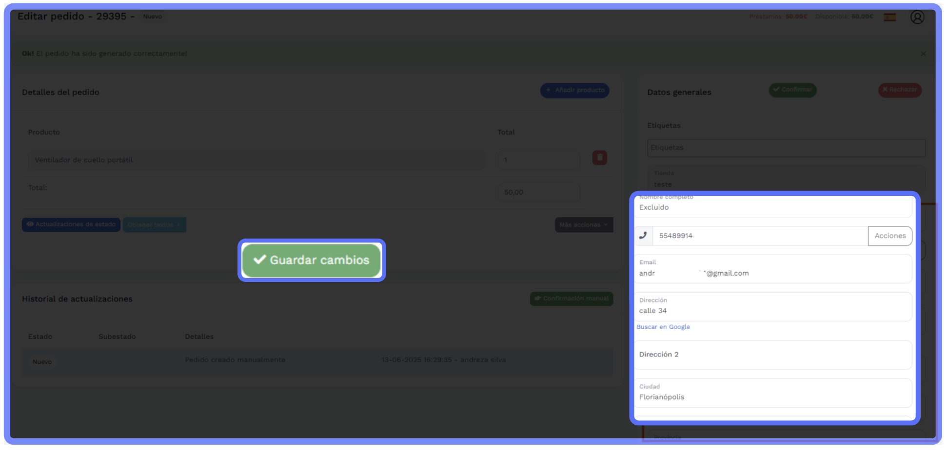 Haz clic en "Guardar cambios" — se mostrará un mensaje de confirmación