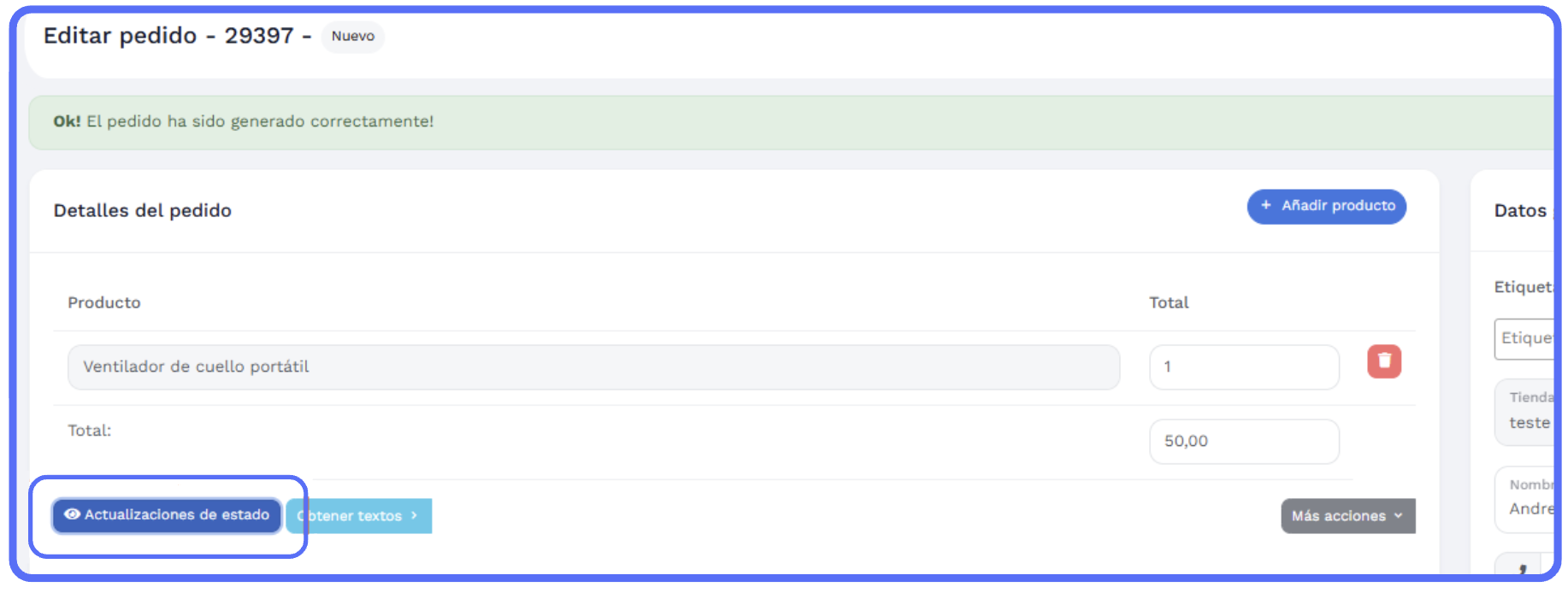 Accede al pedido y haz clic en "Actualizaciones de estado"