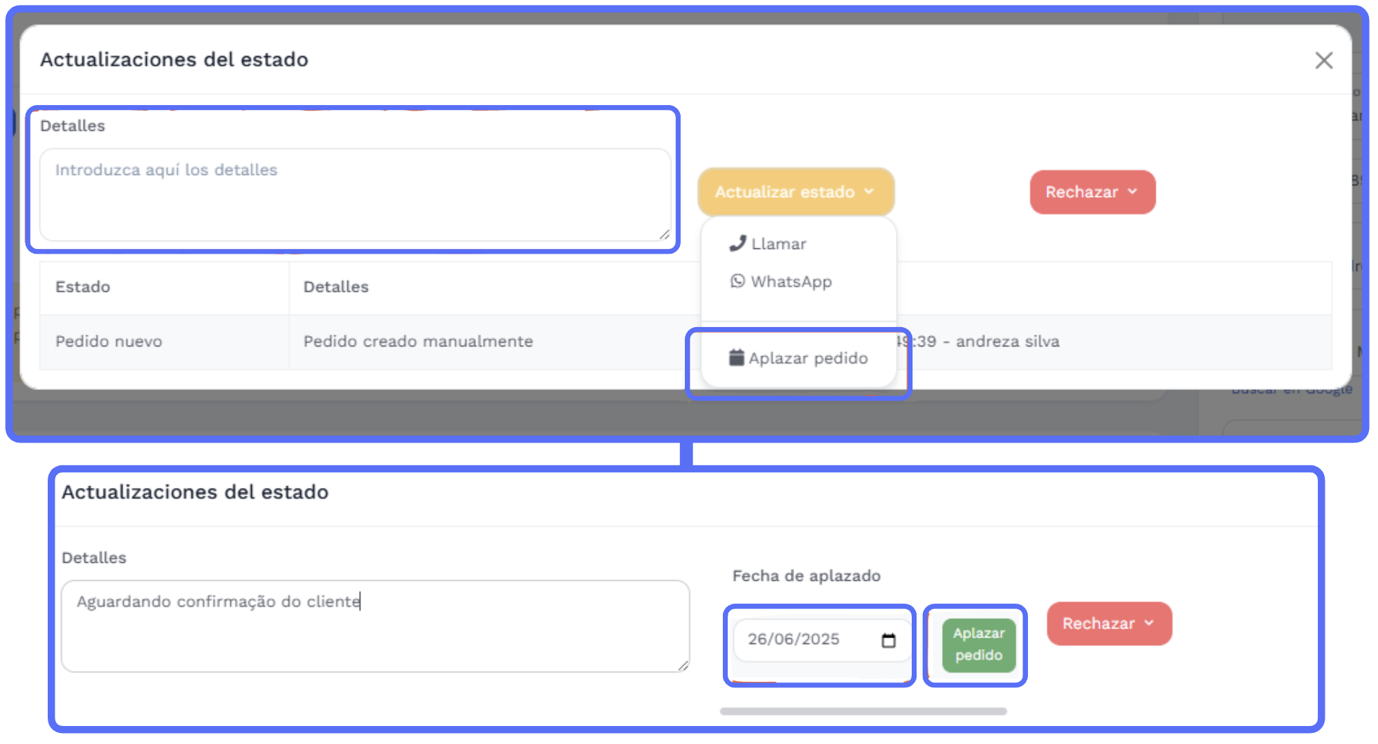 - Haz clic en "Actualizar estado" y selecciona "Aplazar pedido"