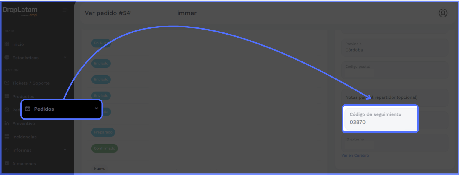Accede a la plataforma DropLatam España y copia el número de GUÍA en los detalles del pedido que deseas rastrear
