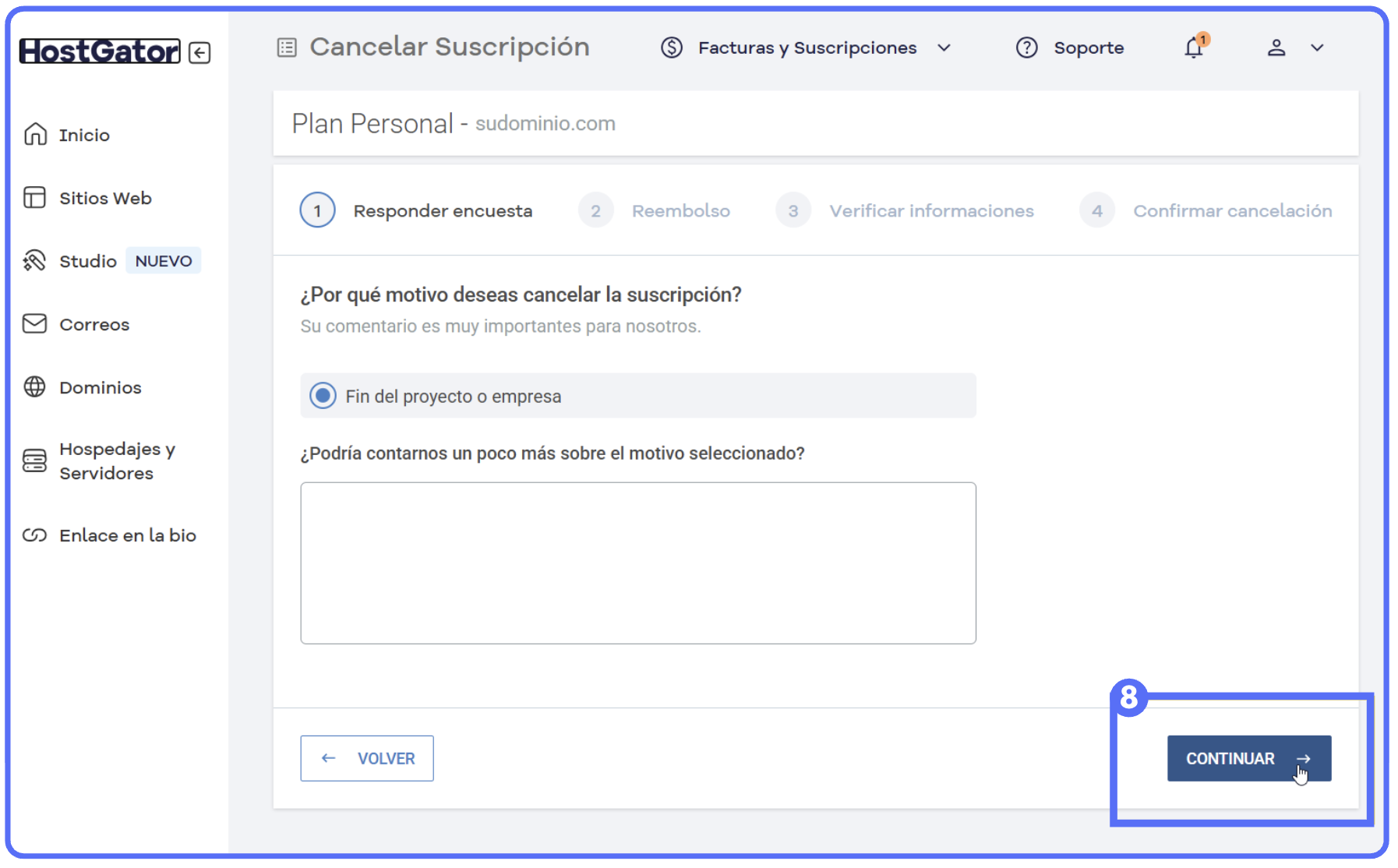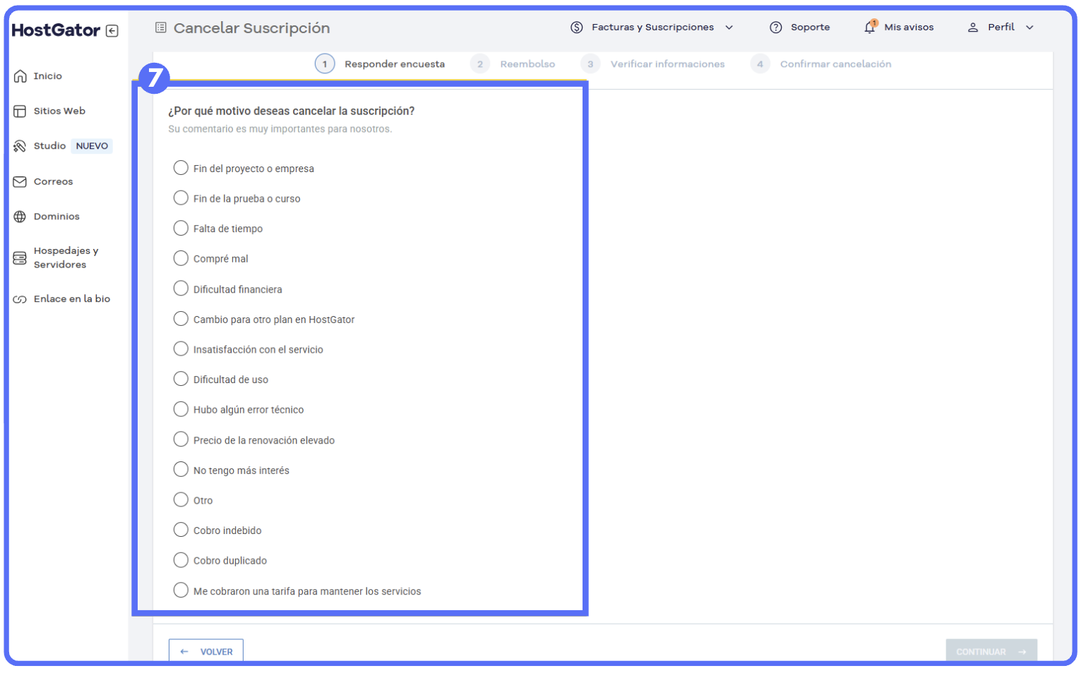(Imagen 4) En "Responder encuesta", selecciona el motivo de cancelación y haz clic en "Continuar" (imagen 5 y 6)