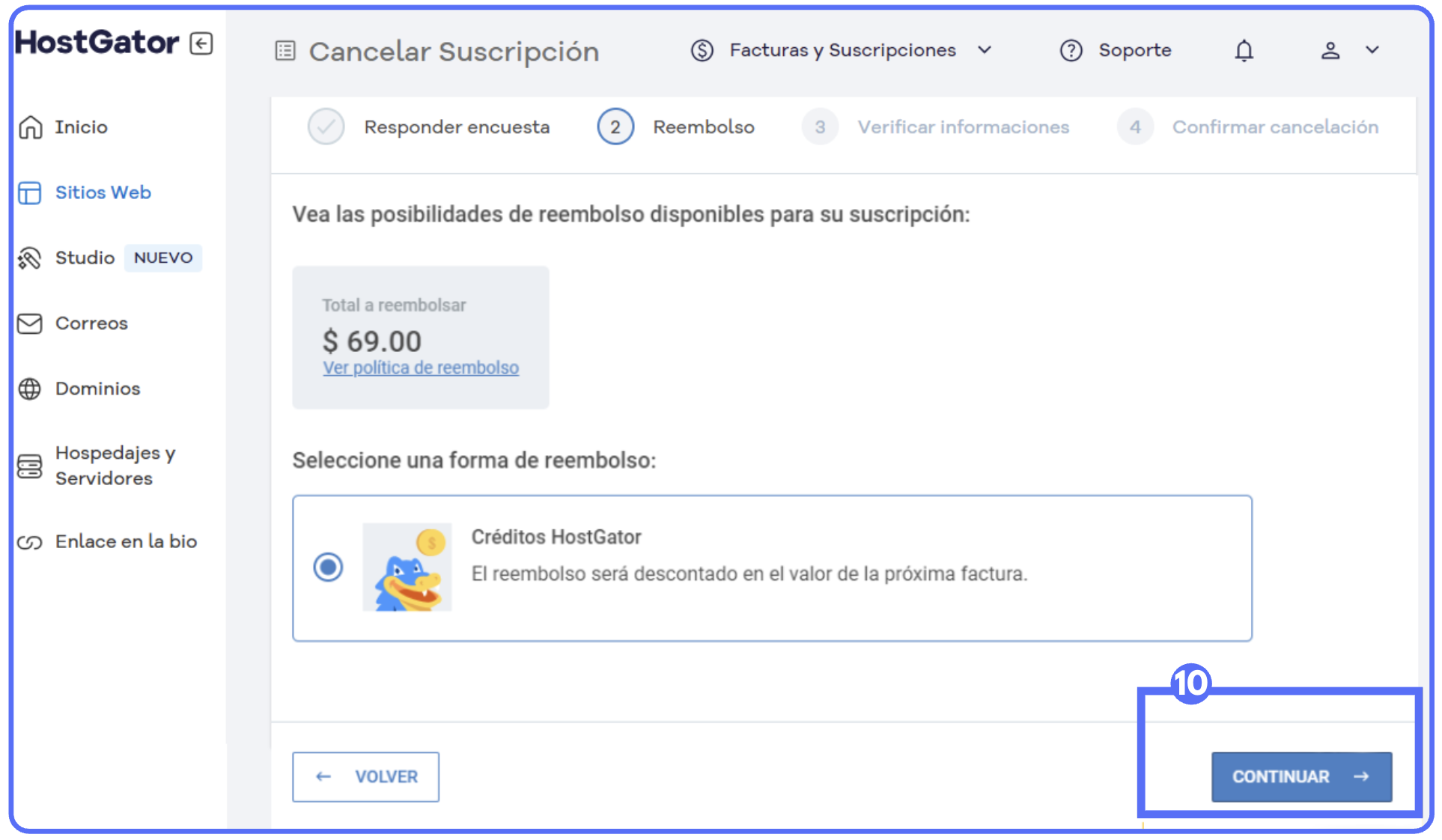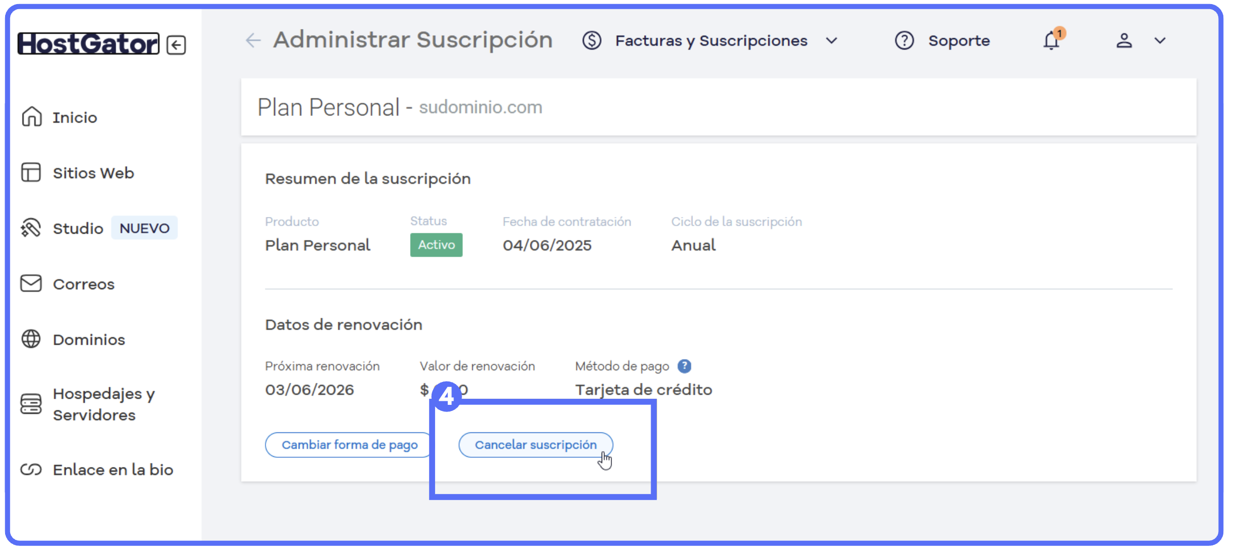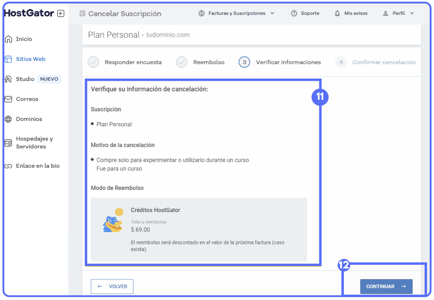 Sin derecho a reembolso: Se mostrará un mensaje indicando que la suscripción no es elegible — consulta la política de reembolso de HostGator para más detalles.