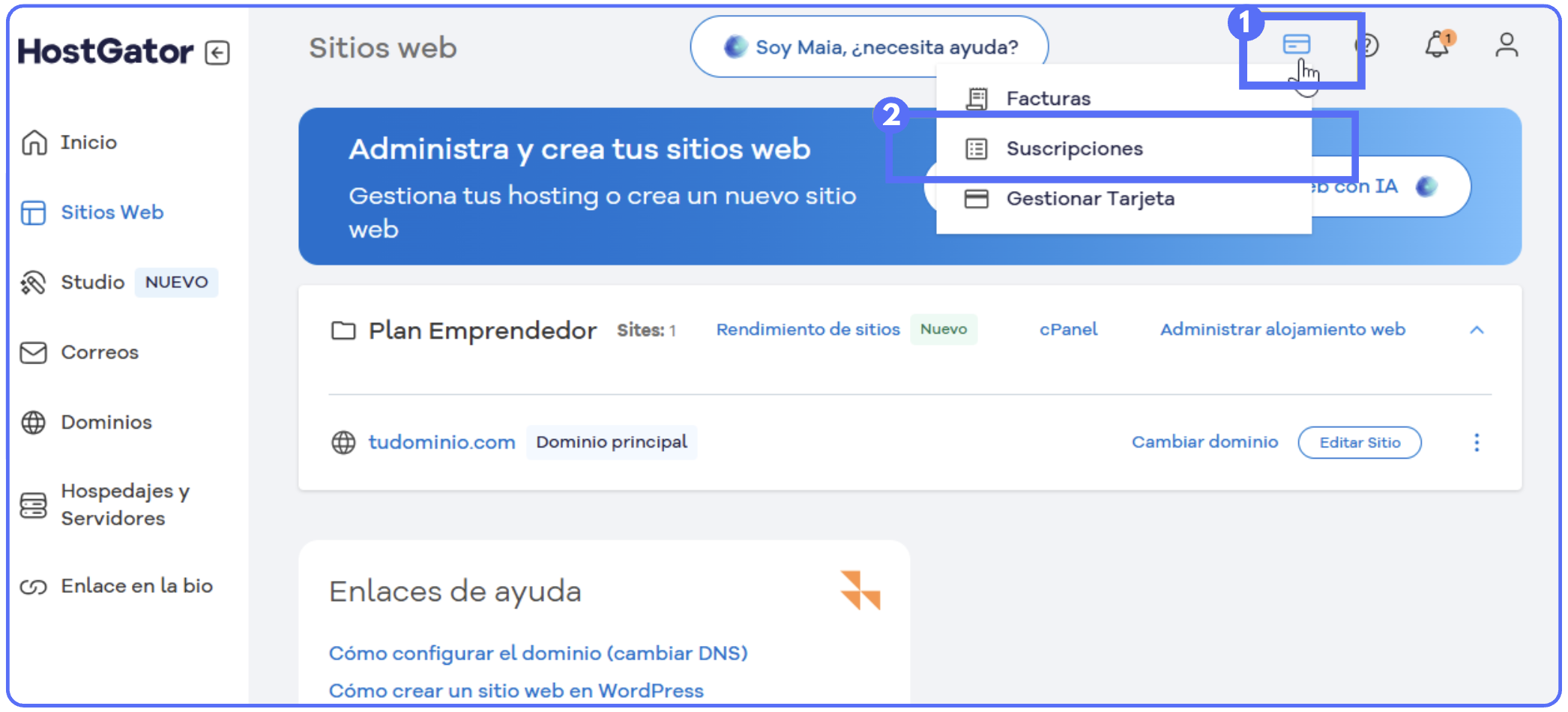 - Accede al Portal del Cliente de HostGator y haz clic en el ícono de tarjeta en el menú superior (imagen 1)
