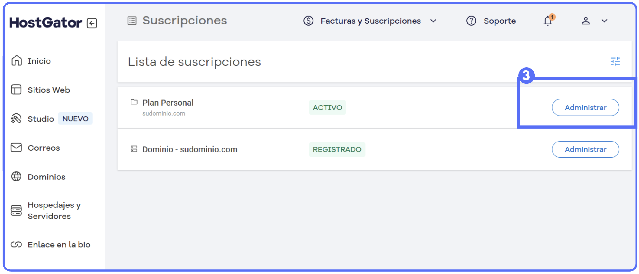 (Imagen 1) Localiza la suscripción deseada y haz clic en "Administrar" (imagen 2)