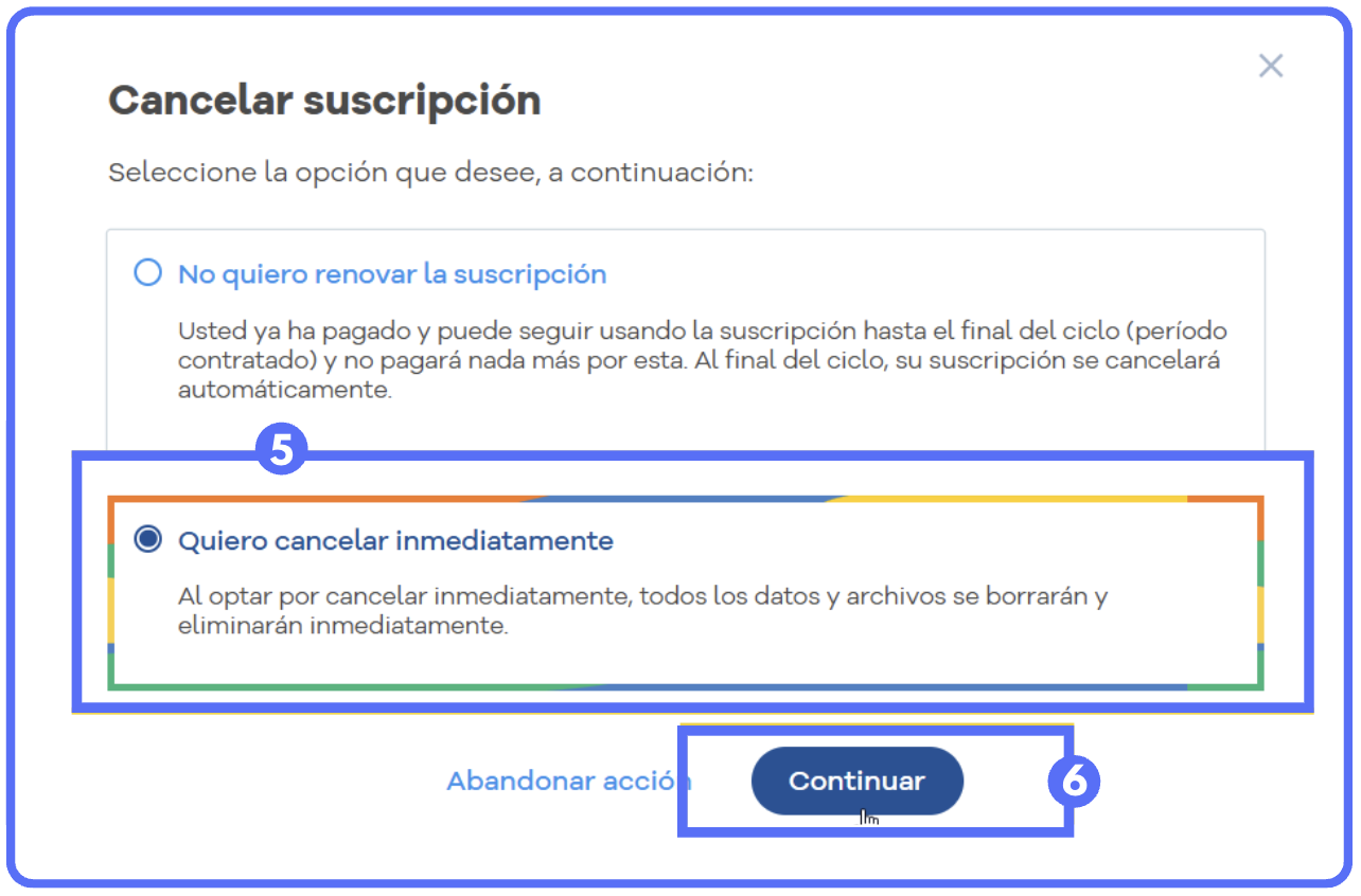 | Cancelar inmediatamente | Suspensión definitiva e inmediata de todos los servicios |