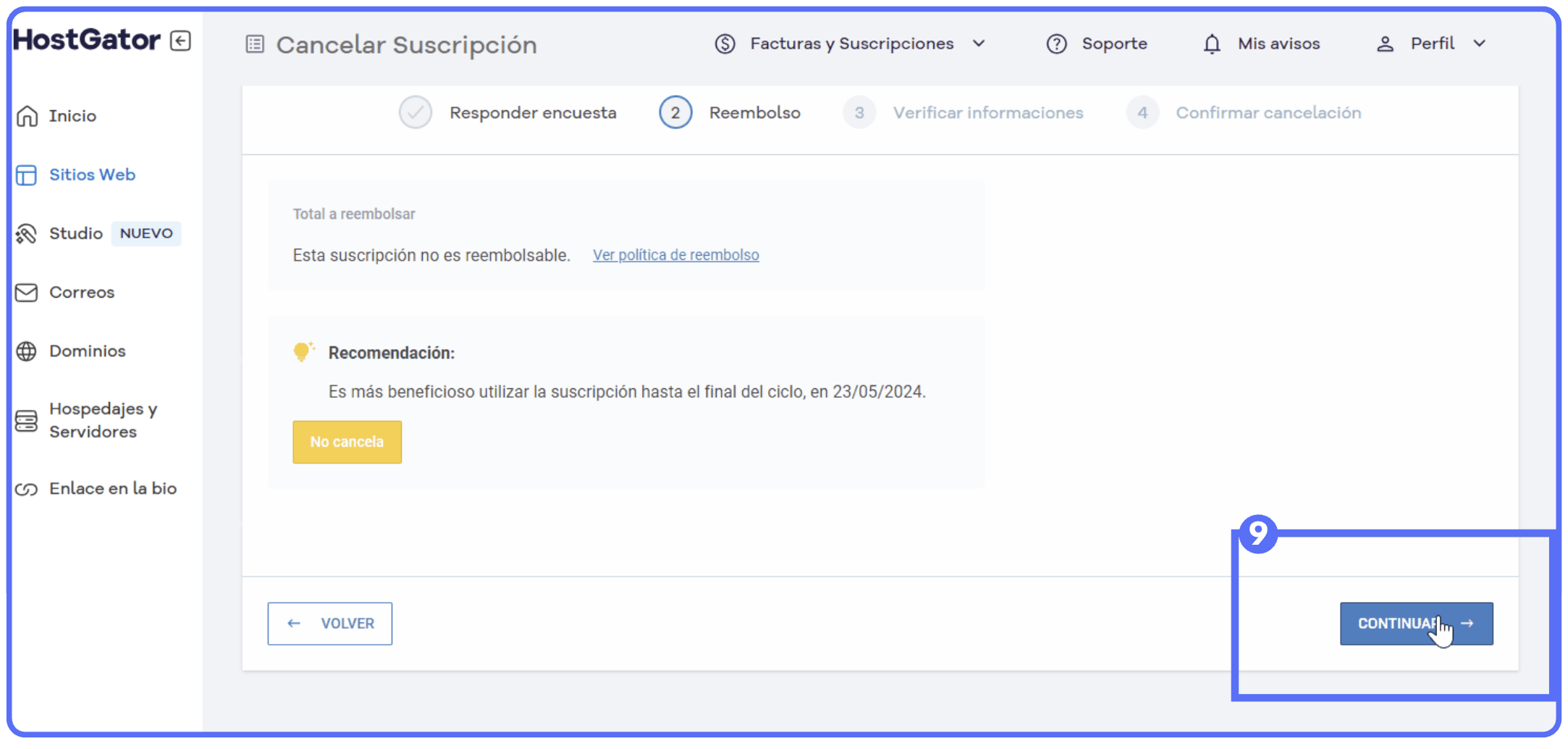 Si deseas mantener el servicio hasta el final del ciclo, haz clic en "No cancela". Si no, "continuar"