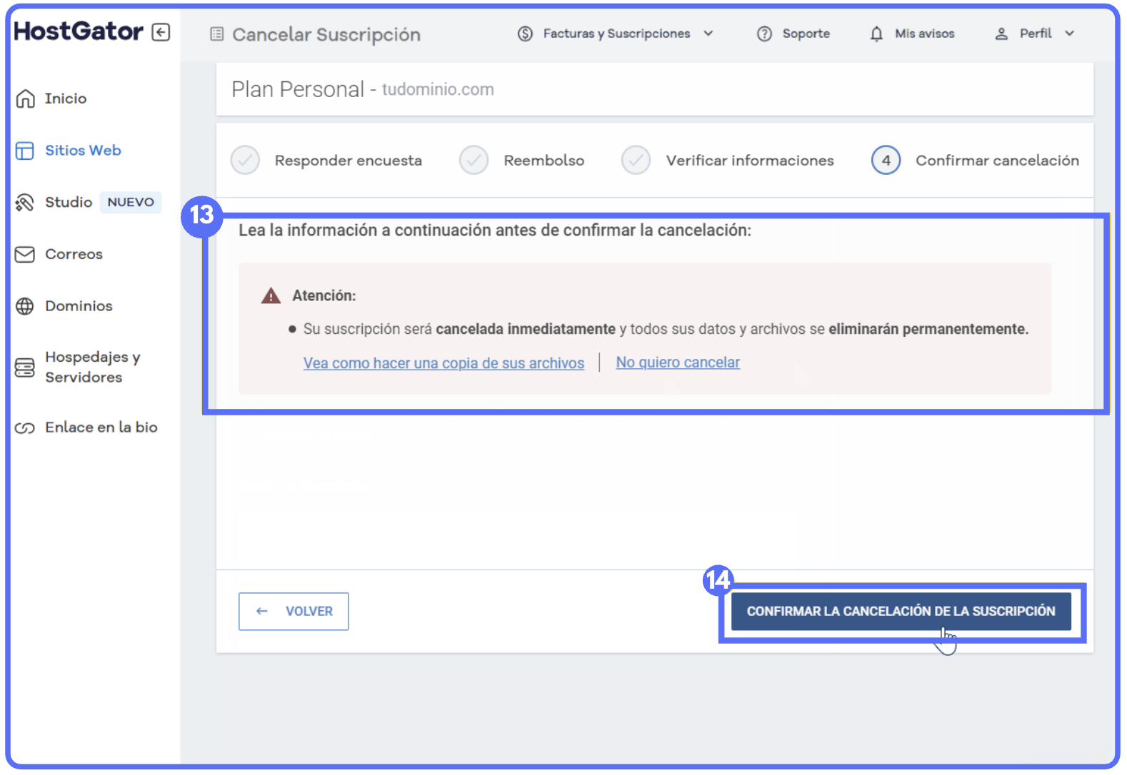 Atención: realiza una copia de seguridad de todos tus archivos importantes antes de proceder con la cancelación inmediata — sitio web, correos electrónicos y demás contenidos serán eliminados permanentemente sin posibilidad de recuperación.