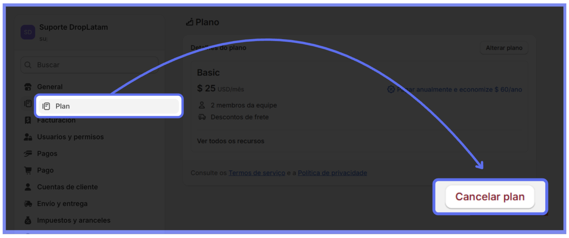 ¿Quién puede cancelar el plan? Solo el titular de la tienda puede realizar la cancelación directamente desde el panel de administración de Shopify.