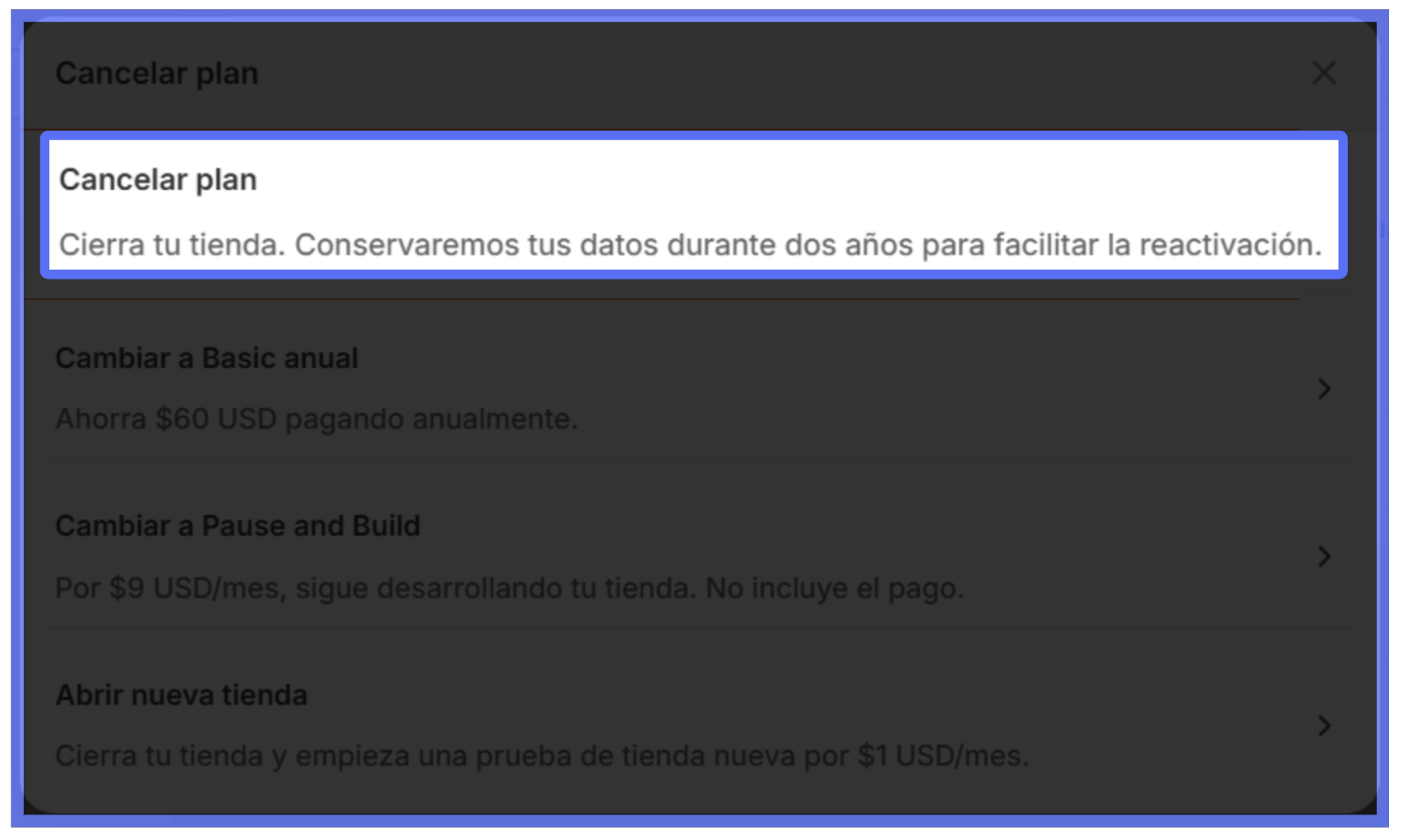 Tengo una tienda Shopify Plus. ¿El proceso es el mismo? No. Las tiendas en el plan Shopify Plus no pueden cancelarse desde el panel — es necesario contactar directamente al soporte exclusivo de Shopify Plus.
