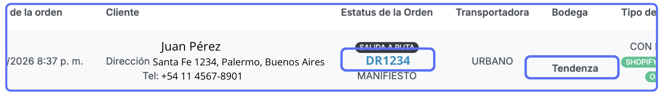 1. Verifica el nombre de la bodega y el número de guía Localiza el pedido en la plataforma DropLatam y consulta la información en los campos "Bodega" y "Estatus de la Orden".